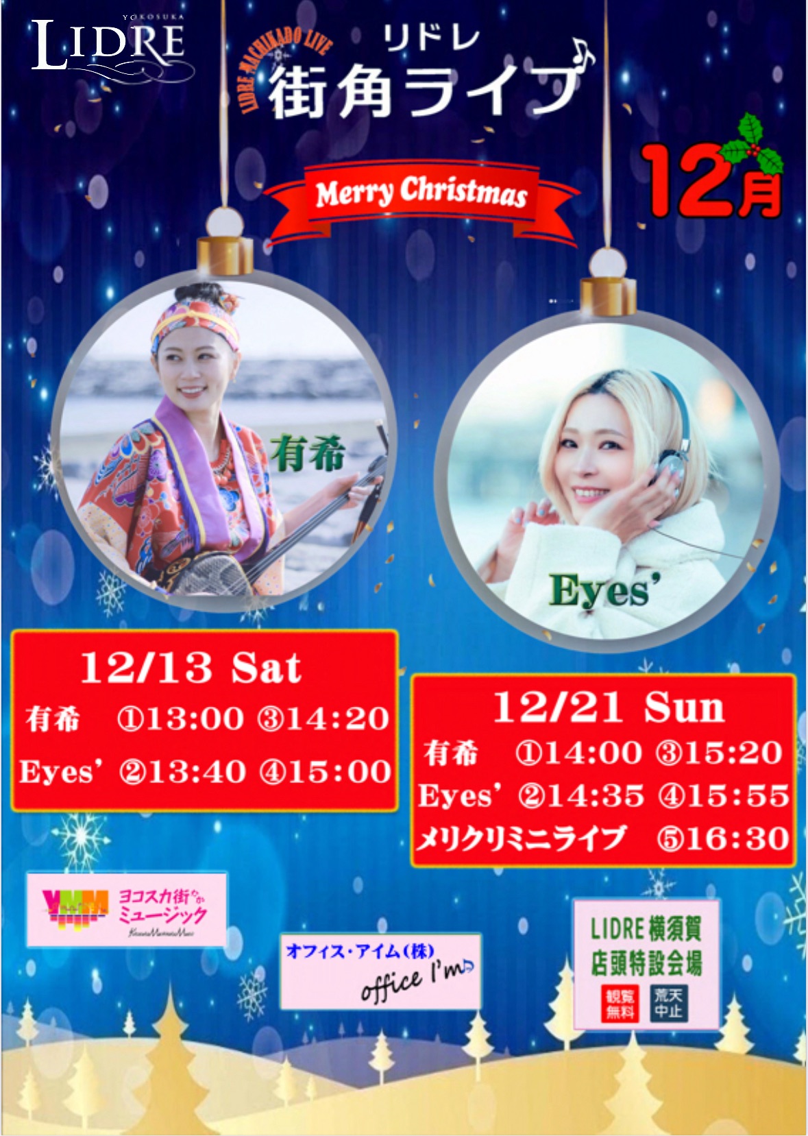 【会場】リドレ横須賀1階店頭https://lidre.jp/【アクセス】京浜急行 横須賀中央駅より徒歩3分13:00~ 有希13:40~ Eyes’14:20~ 有希15:00~ Eyes’※観覧無料※屋外LIVE※荒天中止